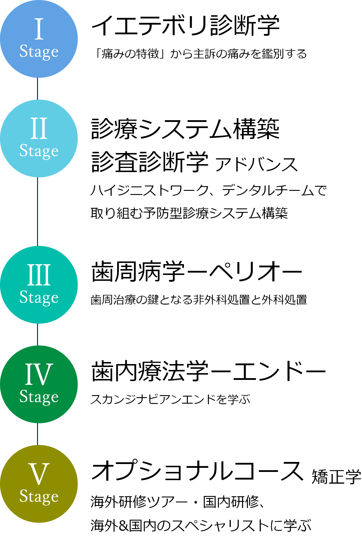 本コースは5つのステージから成り立っており、それぞれイエテボリ大学歯学部大学院の教育方針と哲学をベースとしております。歯科臨床で最も重要な診査診断から始まり、ペリオ、エンド、補綴、矯正、インプラントとスカンジナビアンスタイルの歯科医療をトータルで学べる「歯科医師卒後研修コースカリキュラム」です。